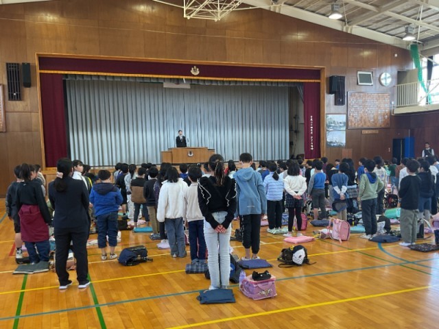 修了式では、はじめに今年度を締めくくる表彰があり、続いて今月の歌、吹奏楽部の演奏で校歌を歌いました。