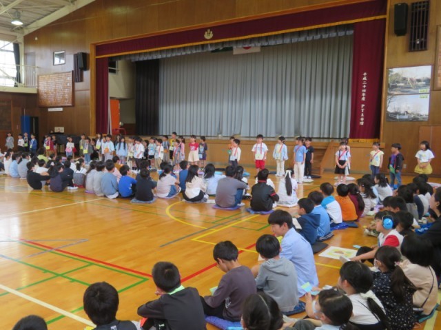 続いて、「誕生月の歌」。自分の誕生月が呼ばれたら、1年生だけでなく2~6年生も、いや、それだけでなく教職員やお招きした学校運営協議会委員の方々も一緒に参加しました。