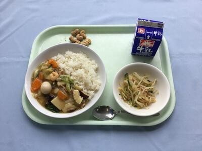 中華丼・もやしときゅうりのサラダ・きなこナッツ・牛乳