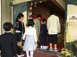 1年生は緊張した面持ちで、6年生と手をつないで入場していました。