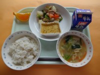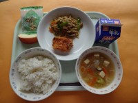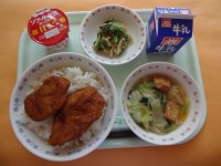 今日は、2年1組プロデュース献立です。から揚げとチンジャオロースのW肉料理、脂...