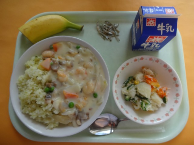 今日の主食「ターメリックライス」のターメリックとは、ウコンのことです。ウコンは、生姜の仲間で亜熱帯地域に多く分布し、アジアの各地で料理、健康食品、薬用、化粧品、魔除けなど、幅広く利用されてきました。料理に使われるのは、秋ウコンです。今日は、このターメリックライスに「シーフードのクリーム煮」をかけていただきます。クリーム煮は、高たんぱくなエビやタラ、牛乳にアサリも加え、鉄分を強化しています。(給食メモより)