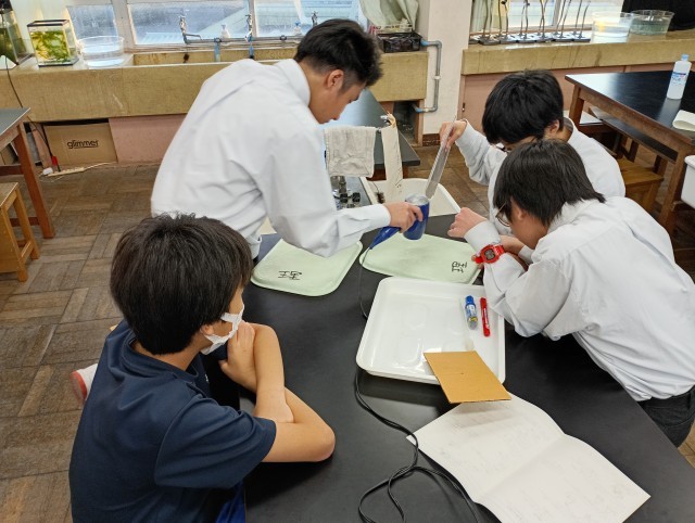 科学部の活動を紹介です! 公開日 2025/12/10 更新日 2025/12/10 部活の様子 3学期に実施を企画している、校内科学実験教室に向けて予備実験を行いました。 「ゾウの歯磨き粉」の実験を噴火モデルとして行う実験の予備実験の結果です。少量で試してみましたが、吹き出す様子がみれました。 部活の様子