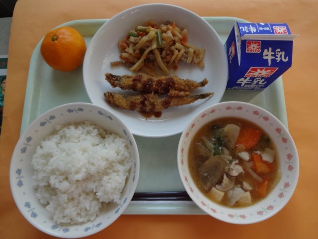 11月26日 公開日 2025/12/11 更新日 2025/12/11 給食 今日の主菜は「ししゃもフライ」です。ししゃもは、成長期の食事にぴったりのカルシウムが豊富な食材です。アイヌ語の「ススハム」から「ししゃも」と呼ばれるようになりました。ススは、アイヌ語で柳。ハムは、葉っぱのことです。漢字でししゃもは、柳の葉っぱの魚(柳葉魚)と書きます。