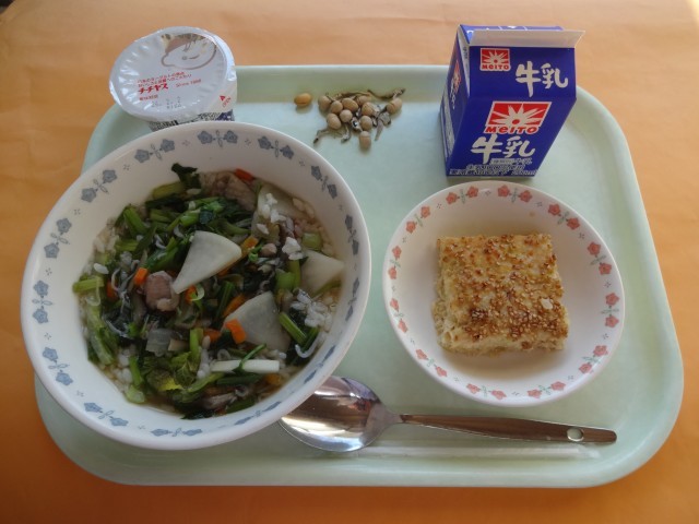 1月は、行事食がたくさんあります。お正月の「おせち料理」、7日の「人日の節句 七草がゆ」、11日の「鏡開き もち」、15日の「小正月 あずきがゆ」です。7日の朝、七草がゆを食べると1年中、病気をしないといわれます。また、疲れた胃を休め、ビタミンやミネラルを補うとも言われています。最近は、行事食を食べない家庭が多くなったようです。そこで、今年、初めての給食は、皆さんの健康を願い「七草風雑炊」です。日本の食文化を大切にする一歩として、春の七草「せり、なずな、ごぎょう、はこべら、ほとけのざ、すずな、すずしろ」くらいは、言えるようにしましょう。(給食メモより)