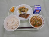 麦ご飯 さわらのごま味噌焼き 野菜炒め 豆腐チゲ しらぬい 牛乳