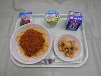 スパゲッティミートソース ポテトみそサラダ スナックアーモンド ヨーグルト 牛乳