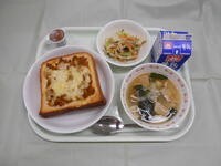 カレーミートトースト ごぼうサラダ ポテトとキャベツのスープ 一口ぶどうゼリー 牛乳