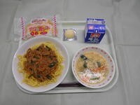 肉みそあんかけ焼きそば 冬瓜入りたまごスープ チーズ いちごクレープ 牛乳
