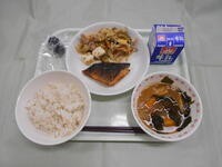 ご飯 ホッケの辛味焼き ゴーヤチャンプルー かぼちゃの味噌汁 ぶどう 牛乳