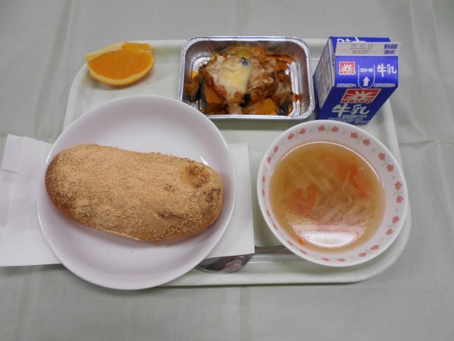 きな粉揚げパン いろどり野菜のミートソース焼き せんぎり野菜スープ オレンジ 牛乳