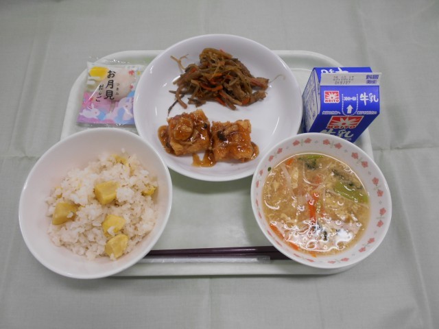 栗ご飯 揚げ豆腐のきのこあんかけ 茎わかめのきんぴら 大根とかまぼこのかきたま汁 お月見団子 牛乳