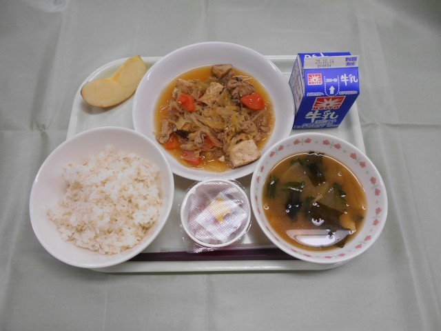 麦ご飯 納豆 肉豆腐 大根の味噌汁 りんご 牛乳