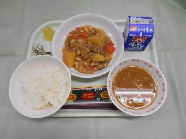 ご飯 韓国のり 大豆入り肉じゃが もやしの味噌汁 いりこアーモンド ひとくちゼリー 牛乳