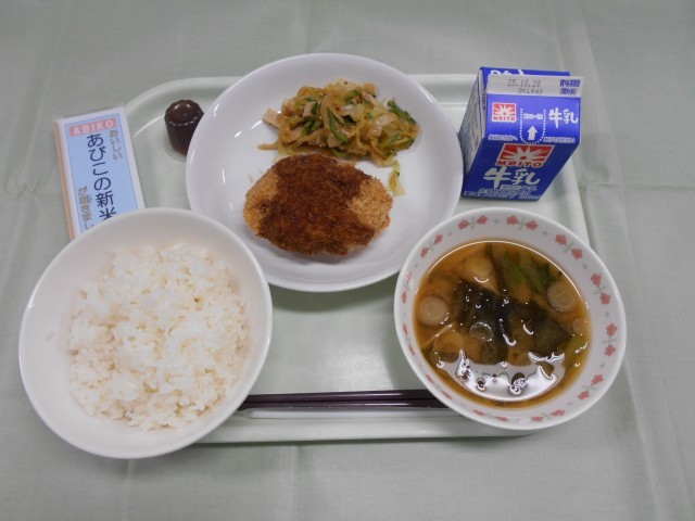 新米のご飯 ごぼうコロッケ 切り干し大根のナムル 豆腐の味噌汁 ひとくちゼリー 牛乳