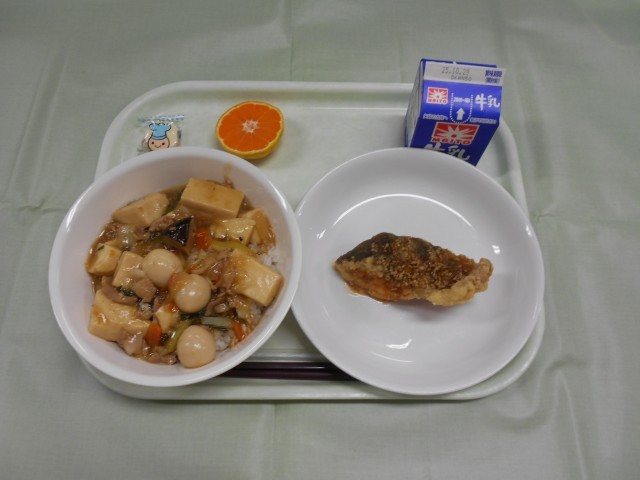 豆腐のうま煮丼 ホッケの油淋鶏ソース チーズ 菊花みかん 牛乳