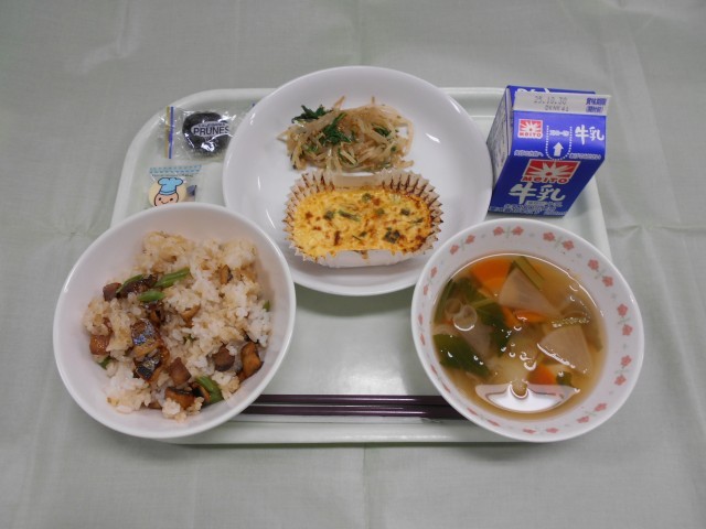 さんまご飯 おからの和風キッシュ もやしのお浸し けんちん汁 チーズ プルーン 牛乳