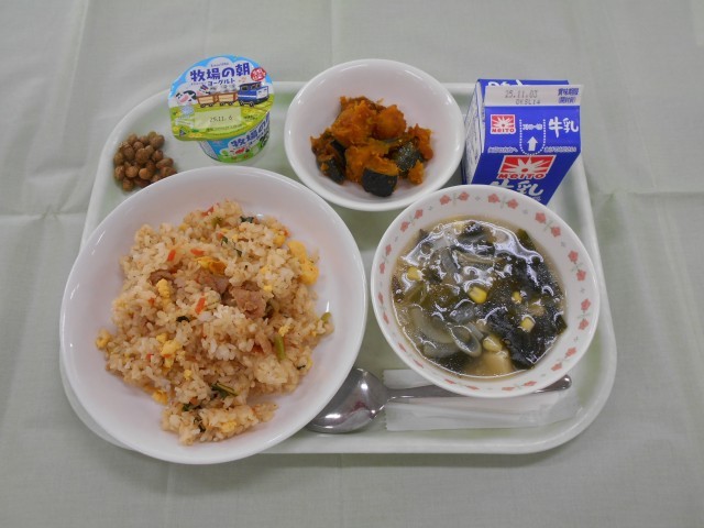 キムチチャーハン かぼちゃの揚げ煮 コーンとわかめのスープ 青のり大豆 ヨーグルト 牛乳