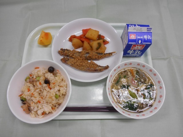 しめじご飯 ししゃものゴマ揚げ じゃがいもの煮っころがし もずく入りかきたま汁 柿 牛乳