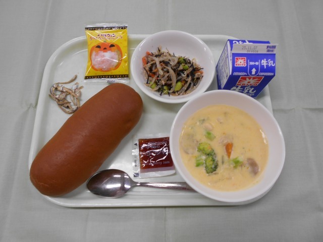 今日の給食は、そんなハロウィン気分を味わえる特別献立です。魔除けのシンボルでもある「かぼちゃ」をたっぷり使った、体が温まるパンプキンシチューと、もちもち食感が楽しいかぼちゃクリームもちを用意しました。