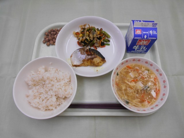 麦ご飯 さばのカレー風味焼き 野菜の海苔おかか和え 大根とかまぼこのかきたま汁 ココア豆 牛乳