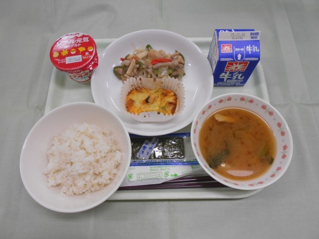 麦ご飯 味付け海苔 グリーンロケッツオムレツ チキンとオニオンのポン酢しょうゆ炒め 大根の味噌汁 ヨーグルト 牛乳