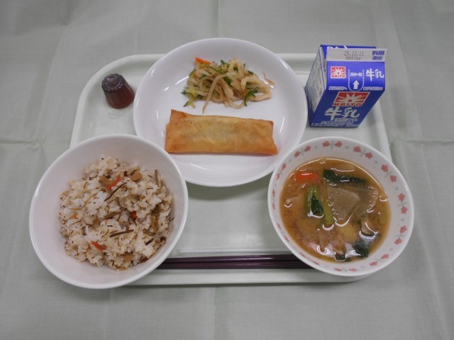 磯ご飯 かますのチーズ春巻き 華風和え さつま汁 ひとくちゼリー(ぶどう) 牛乳