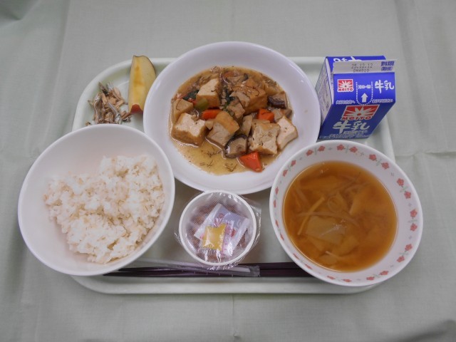 麦ご飯 納豆 生揚げの五目煮 いりこナッツ キャベツの味噌汁 りんご 牛乳