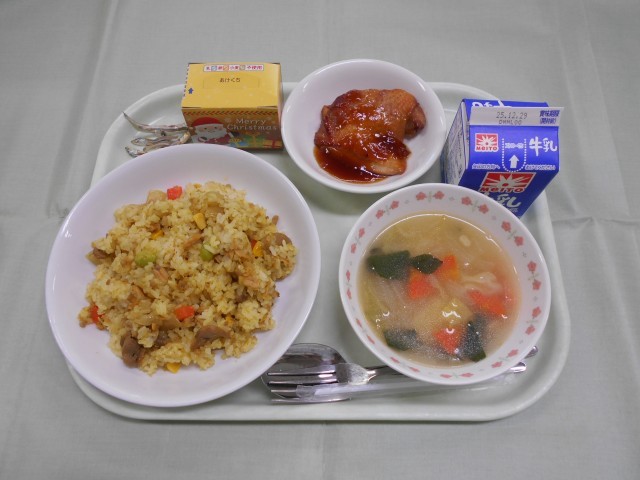 今日で2学期の給食は終わりです。イベントが多い冬休みは食生活が乱れやすく、夜更かしによる朝食欠食も増えがちです。しかし、成長期にある皆さんにとって、規則正しい食生活は健康な体づくりだけでなく、学習や部活動のパフォーマンスを維持するためにも欠かせません。「早寝・早起き・朝ごはん」を基本に、生活リズムを崩さないよう意識しましょう。また、年末年始は地域の伝統料理に触れる絶好の機会です。行事食の由来を学びつつ、3学期の始業式にまた元気な笑顔で会えることを楽しみにしています。