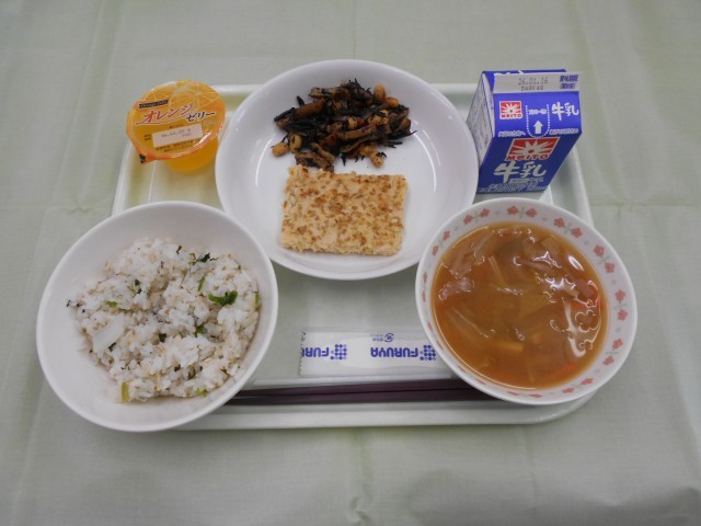 七草ご飯 松風焼き ひじきの五目煮 白菜の味噌汁 オレンジゼリー 牛乳