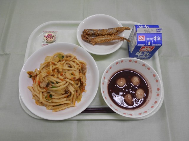 焼うどん ししゃものごま揚げ チーズ もち入りぜんざい 牛乳
