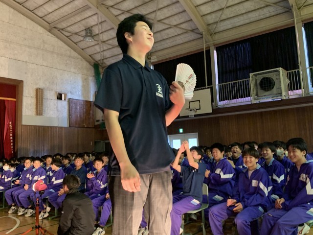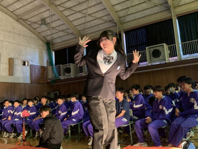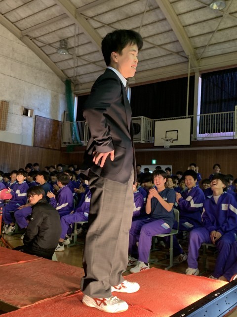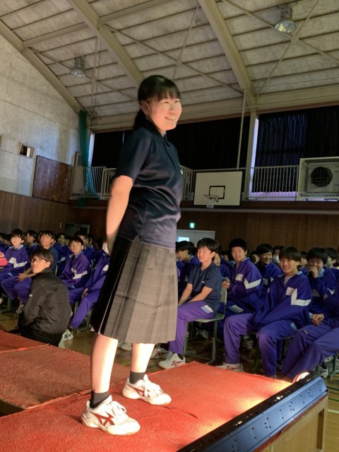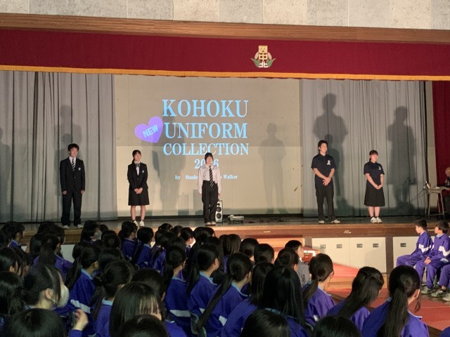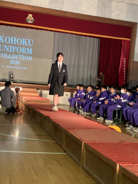 新1年生より、新しい制服になるので在校生へお披露目会をしました。