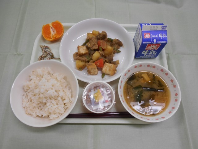 麦ご飯 納豆 じゃがいもの南蛮煮 大根の味噌汁 煮干し ぽんかん 牛乳