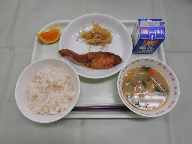 ご飯 鮭のレモンソースかけ 白菜のごまお浸し お講汁 清見オレンジ 牛乳
