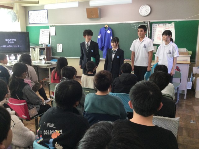 新1年生から、新しい制服になるため生徒会の子供たちが冬服、夏服を着て説明をしに小学校へ行ってきました。
