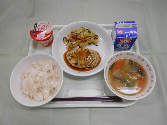 麦ご飯 豆腐とひじきのハンバーグ キャベツの塩昆布和え すいとん カップdeヤクルト 牛乳