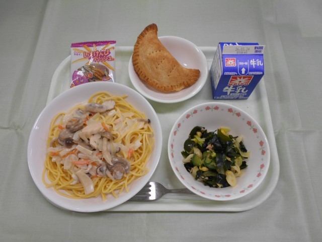 きのこクリームスパゲティ わかめサラダ いもけんぴパリッシュ 手作りアップルパイ 牛乳