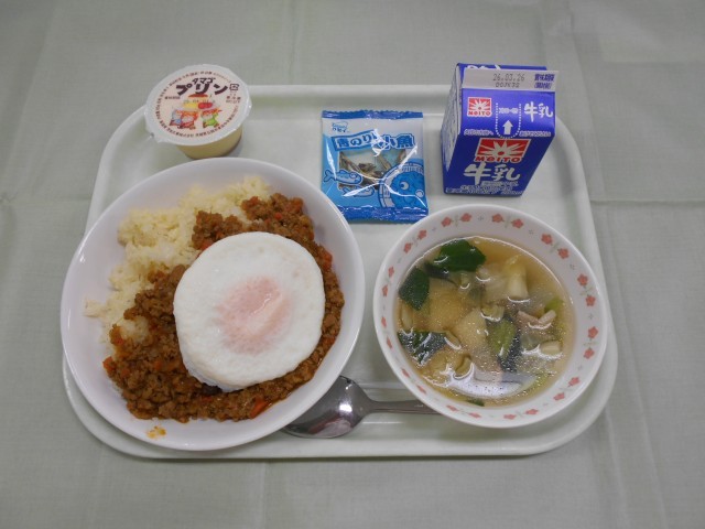 ドライカレーライス まるオムレツ キャベツとポテトのスープ 青のり小魚 タマゴプリン 牛乳
