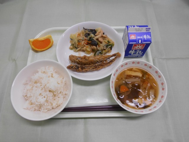 麦ご飯 ししゃものごま揚げ 野菜の五目炒め 白菜のみそ汁 清見オレンジ 牛乳