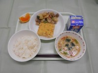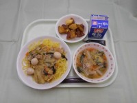 あんかけ焼きそば 白菜と肉団子のスープ 大学芋 ミルメークコーヒー 牛乳今日は我...