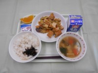 麦ご飯 手作りひじきふりかけ 生揚げとキャベツのみそ炒め 白玉団子汁 アーモンド...