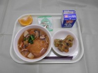 きつね餅うどん ちくわの磯部揚げ お魚アーモンド いよかん 牛乳今日の給食は、高...