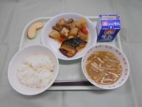 ご飯 さばの韓国風焼き 鶏と野菜のごま煮 キャベツのみそ汁 りんご 牛乳