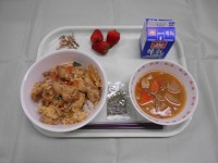 油麩丼 豚汁 いりこアーモンド いちご 牛乳