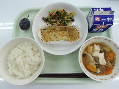 牛乳、ご飯、さわらのみそマヨネーズ焼き、菊花和え、けんちん汁、プルーン