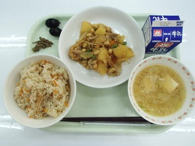 牛乳、こぎつねご飯、カレー小魚、大豆入り肉じゃが、キャベツのみそ汁、ぶどう