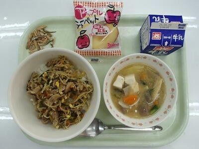 牛乳、ネギ塩豚丼、いりこナッツ、お講汁、冷凍リンゴ