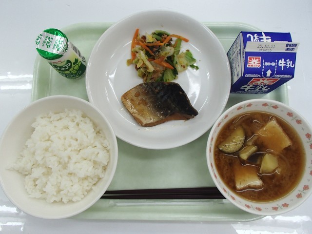牛乳、ご飯、さばのオレンジ煮、白菜のおかか和え、なすじゃがいものみそ汁、乳酸菌飲料