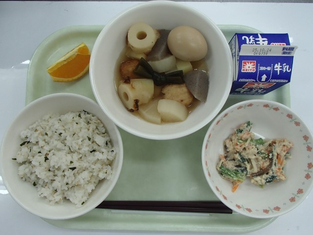 牛乳、わかめご飯、おでん・卵のしょうゆ煮、こまつなの白和え、オレンジ