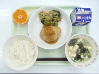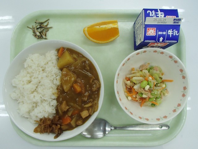 牛乳、チキンカレーライス、福神漬け、煮干し、枝豆とツナのサラダ、オレンジ